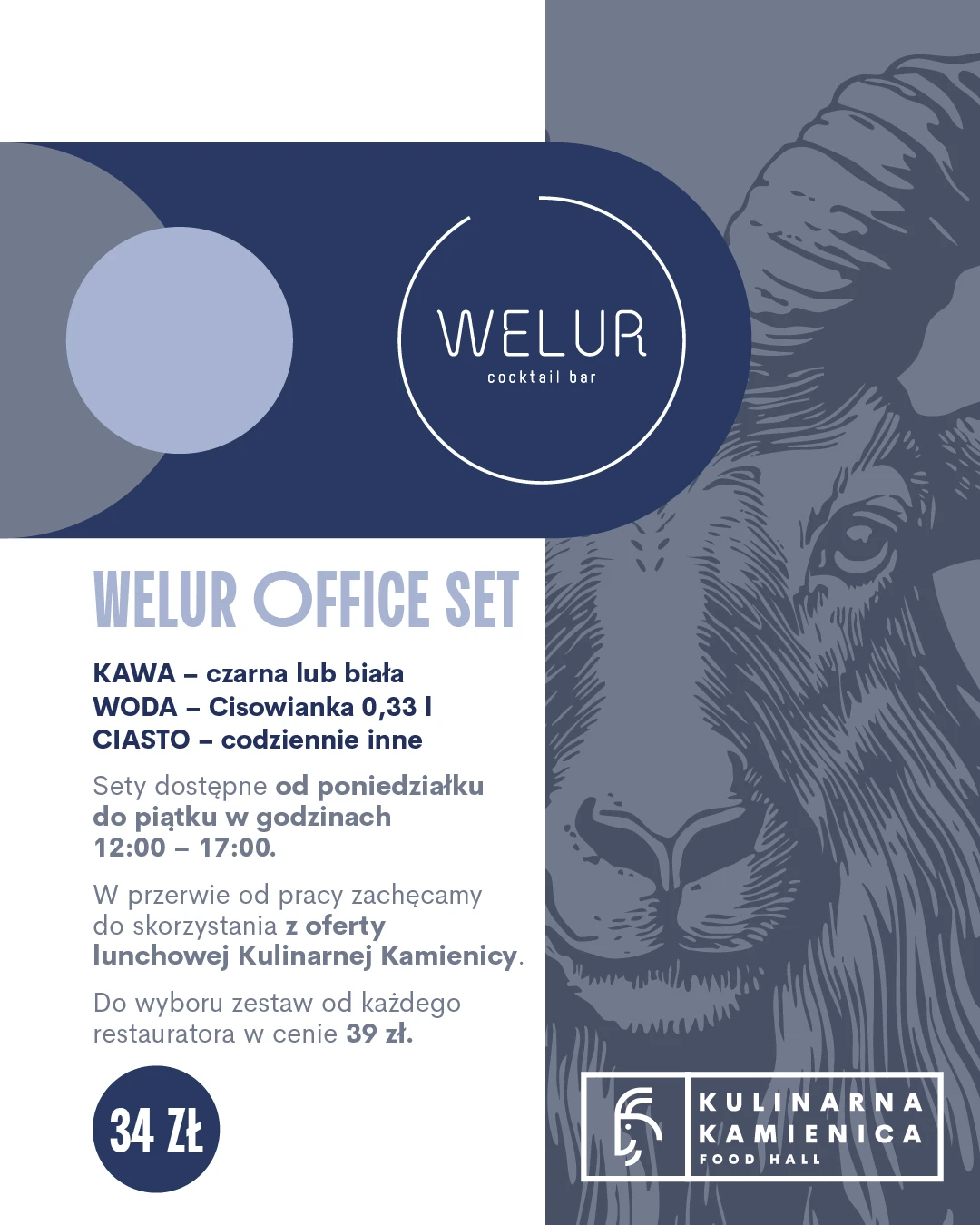 Na pierwszym piętrze znajduje się Welur – koktajl bar z wyjątkową atmosferą, który można także zarezerwować na prywatne wydarzenia i spotkania wymagające szczególnej oprawy.