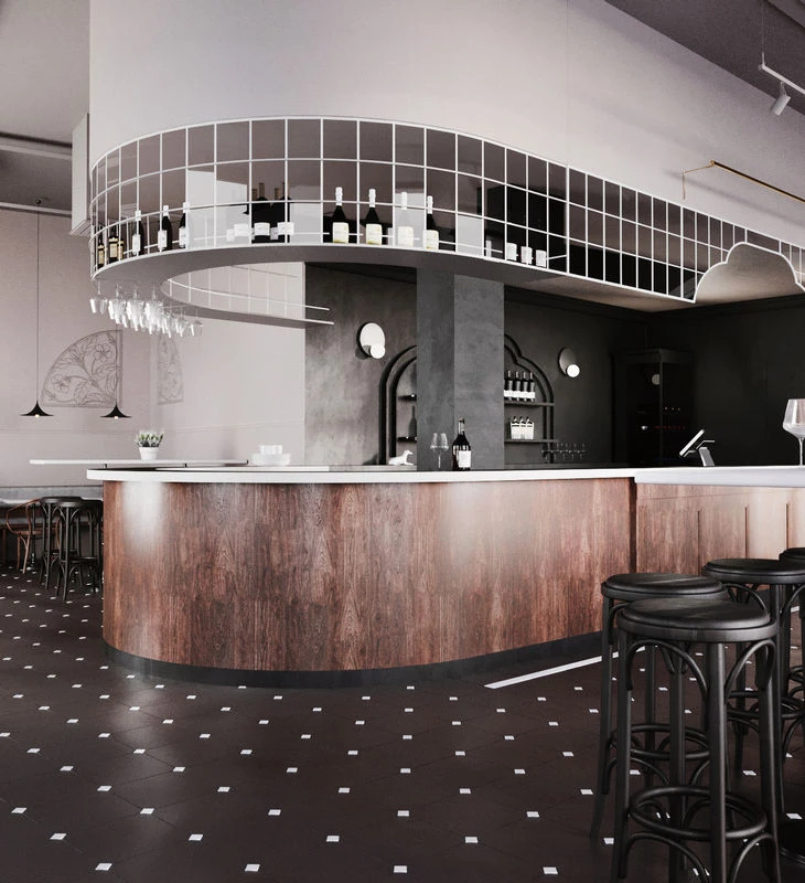 Główny bar Kamienicy – okazały i pełen charakteru, ulokowany w secesyjnej strefie. Przyciąga uwagę od pierwszego kroku i jest naturalnym centrum spotkań na parterze.